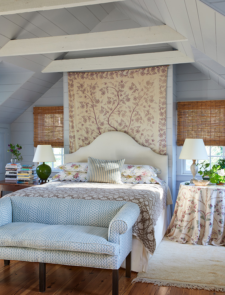 The trick to working with fabrics, wallpapers, and pattern—in general—is not to do the same tempo the whole way through the house. It’s important to create a cadence between spaces. You might use a soft, small pattern in a corridor, and then a bolder pattern in a bedroom, and then create a separate, painted space hung with pictures.