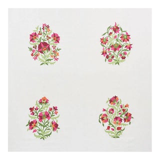 Four enchanting and slightly different floral motifs are embroidered on a linen ground. Each colorful bouquet is positioned and scaled …