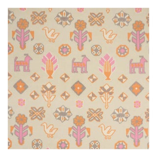 Figurative horses, birds, and flowers mingle across this happy pattern-a true warp print in an ikat style that's charming, sophisticated, and accessibly exotic. Also available as wallcovering.