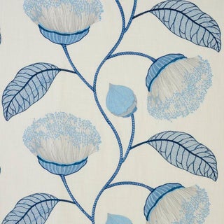 Perfect for curtain panels, this open, large-scale design features artfully embroidered sunflowers with delicately braided stems.