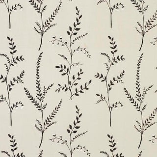 Hand printed botanical with hand embroidered details, this understated design features artful blossoms on a muslin-like ground.