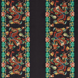 This over-the-top, double-stripe dragon pattern inspired by 18th-century Chinese carpets juxtaposes intricate, labor-intensive embroidery against a down-to-earth linen ground.