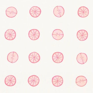 A simple grid of hand-drawn citrus slices, this imaginative polka dot pattern has Vera Neumann's signature tongue-in-cheek humor and whimsical charm. Also sold as a wallpaper. Sold as a 2-yard minimum.