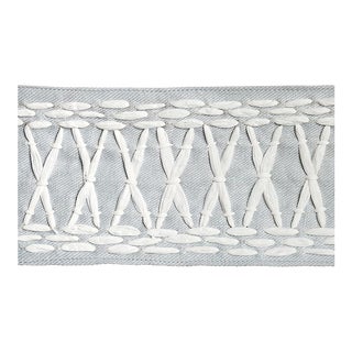 Created in collaboration with Mary McDonald, Tikki Tape is a substantial trim with a graphic crisscross pattern embroidered in raffia. This pronounced, textural design adds a striking and exotic finishing touch to furniture, pillows or window treatments.