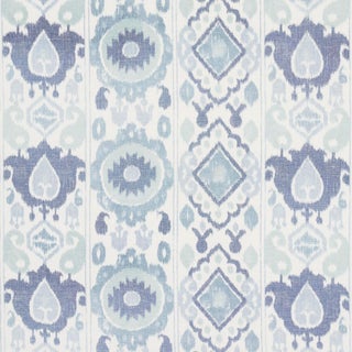 A true warp print ikat with watery colorations, this delicate stripe has an exotic vibe and is the perfect scale for upholstery. Also available as a wallcovering.
