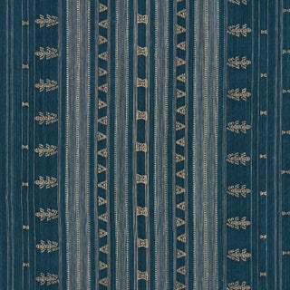 A refined, multi-width stripe, Nima Embroidered Cotton Linen was inspired by a vintage blanket from India. Made of hand-dyed yarns, this refined, rhythmic pattern is created on an antique wooden loom and embellished with embroidered floral and geometric details. Heavy and tightly woven, this fabric lends exquisite texture and dimension to upholstered pieces and pillows.