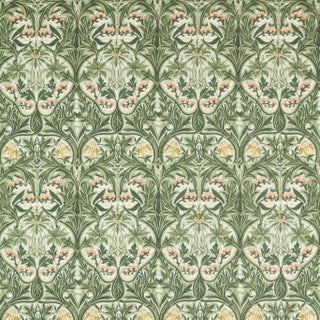 Perhaps one of the most endearing qualities of William Morris was his love for ordinary flowers native to the UK. Bluebell is an 1876 design that takes as its subject the charming but common bluebell flower. Morris’s design is a richly packed symmetrical arrangement and continues his tradition of naming the design after the secondary flower. Framed by bold acanthus leaves and entwined by larger foliage the humble bluebell weaves this design together like it does the forest floor in spring.