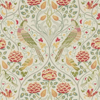 As its title suggests this wallpaper is inspired by a set of embroidered panels depicting the seasons in stitch-work designed and probably also embroidered by May Morris c.1895-1900. Now reinterpreted as a wallpaper Seasons by May features parakeets stylised roses tulips turning stems leaves and flowers amongst a mirrored trellis. Available in three colourways: A neutral Linen smart Indigo and striking Saffron which has a metallic ground.
