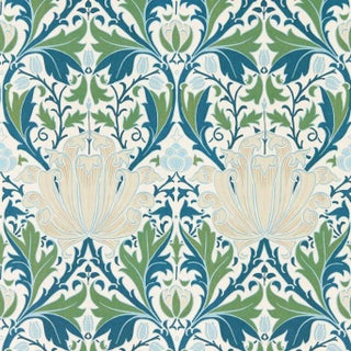 J. H Dearle`s vision for Helena designed in 1891 as a woven jacquard reflects his profound fascination with the detailed textiles of Persia and Turkey which held his gaze during his peak as a designer. The intricate pattern seamlessly blends artichoke flowers against a backdrop of acanthus leaves and fritillaries. In Morris & Friends Helena is taking its place gaining much-deserved recognition in heritage hues of peach teal and shades of indigo.