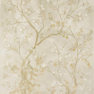 Based on a delicate chinoiserie panel depicting peacocks perching on blossom branches and mirroring the fabric design of the same name this contemporary wallpaper has been repainted and printed in soft colourways with twists of colour bleached out to create a gentle aged effect.
