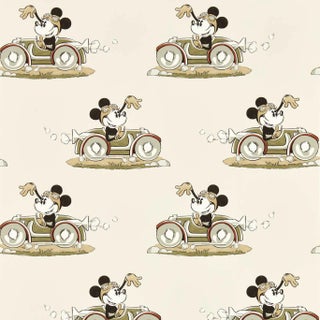 This design of Disney`s Minnie Mouse out and about in her open top car is inspired by a beautifully hand painted wall sticker from our archive. Full of cheer and personality Minnie waves to passing friends as she drives across this exacting replica in three fresh new colourways.