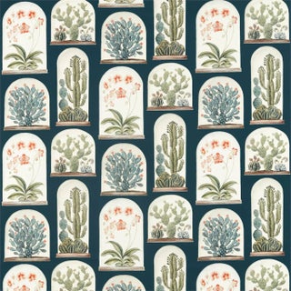 A fabulous and unique design depicting exquisitely observed cactus plants and orchid flowers encapsulated in a glass-domed terrarium. Mica highlights …
