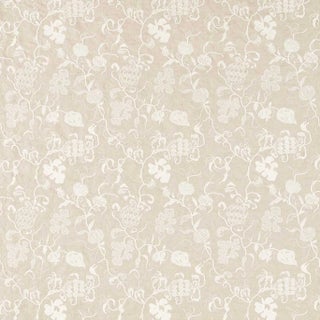 From his renowned walnut ink illustration Mydsommer Pickings is a direct translation of Giles`s botanical drawings depicting embroidered pomegranates and poppyheads on a linen ground. The pattern is repeated to create an all over design and encompasses a plethora of stitching techniques layered to intensify the depth and luxury of this embroidered fabric. An apothecary of medieval delights appears in this curling tendril design which unfurls before your eyes. Referencing historic hand embroidery the linen base enhances the lavish stitching which is free-flowing and organic yet dramatic in equal measure and loosely based on drawings of Chelsea Physic Garden.