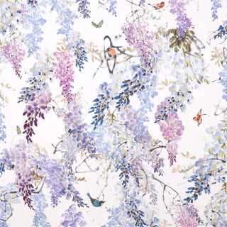 Beautiful butterflies and birds dart between branches of a blossoming wisteria on this 100% linen fabric design. A stunning addition to rooms when used as curtains and blinds.