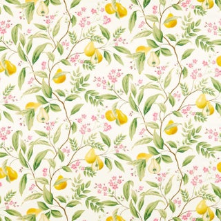 Feminine and floaty Diane’s love for botanical painting shines through in this soft gentle design that’s printed on luxurious cotton/satin. Named after Marie Curie juicy pears and trailing vines accented with delicate blossoms recreate a very English feel.