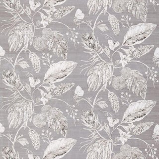 Palmetto Fabrics - Amborella Silk. A botanical vintage-style silk fabric design featuring delicately drawn butterflies pinecones and exotic flowers. Elegant for blinds and drapes.