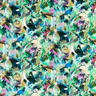 Blink and you’ll miss them! Our spectacular birds of paradise dance amongst the darkness of their rainforest home. Look twice – how many incredible plumages and tailfeathers can you spot? Full of movement yet colourful and camouflaged this dual-purpose cotton is an absolute showstopper.
