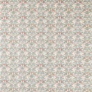 A unique design initially intended for stained glass possibly by Duncan Dearle J.H. Dearles brother who worked in stained glass. Refined and repainted the layout has been transformed while retaining the stained-glass references. A double stripe underlies a graceful arrangement of blossoms oak leaves and acorns. A block-printed texture has been added to this otherwise graphic design and a soft palette complements the striped back look.