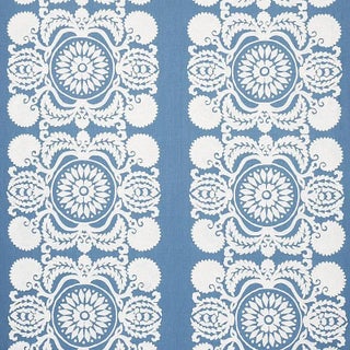 This captivating large-scale design has stylish drama and folkloric charm, with an intricately embroidered pattern that recalls Mexican Otomi textiles and Central Asian suzanis. Sold as a 2-yard minimum.