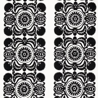 This captivating large-scale design has stylish drama and folkloric charm, with an intricately embroidered pattern that recalls Mexican Otomi textiles and Central Asian suzanis. Sold as a 2-yard minimum.
