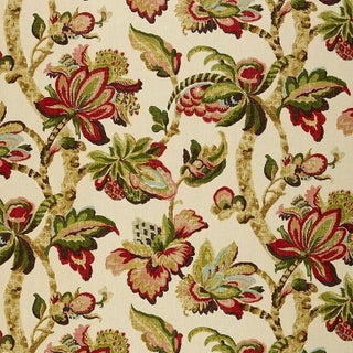 This fanciful tree of life print was inspired by a 1920s block-printed document. The bold colors and motifs have been intentionally softened to give a room instant patina. Sold as a 2-yard minimum.