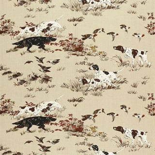 With its field dogs and fluttering quail, Pointers in yellow is a classic hunting scene that speaks to lovers of canines and country life. A painterly print on a soft, Linen ground, this fabric is suitable for upholstery, windows, or pillows, and makes a wonderful companion for other patterns. Sold as a 2-yard minimum.