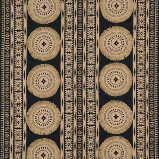 Inspired by Tapa cloths from the South Pacific, this print has a circle motif edged in a primitivist border. The … Read more Inspired by Tapa cloths from the South Pacific, this print has a circle motif edged in a primitivist border. The embellised version incorporates fringed , embroidered and beaded elements. Sold as a 2-yard minimum. See less