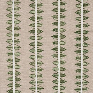 Alva Hand Block has a beautifully home-spun appeal. The Vertical stripes in the hand-woven fabric are adorned with block-printed rows of feathery, fern-like leaves for a charming effect. Sold as a 2-yard minimum.