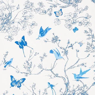 Vibrant winged creatures flutter among delicate foliage in porcelain Birds & Butterflies, a celebrated pattern inspired by a handprinted, 1960s wallcovering in our archives. Cheerful and charming, this large-scale design animates furniture, windows, or pillows with its loose, painterly aesthetic. Also available as a wallpaper. Sold in a 2-yard minimum.