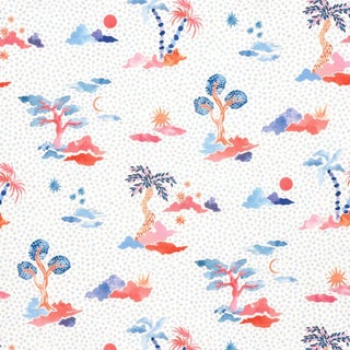 "Inspired by the ancient capital of Malta, Valetta evokes the romance of a distant land with its exotic trees and celestial bodies floating on a stippled oceanic background. This enchanting fabric, designed by Happy Menocal, features wonderful tonal variations and a unique hand-painted aesthetic. Also available as a wallpaper. Sold as a 2-yard minimum.