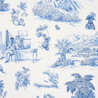 Created in collaboration with Haitian American fashion designer Victor Glemaud, Toussaint Toile wallpaper pays homage to the artist’s Caribbean heritage. Featuring historic scenes that celebrate Haiti’s liberator, Toussaint Louverture, along with the country’s native flowers, foliage and landscapes, this large-scale pattern is an inventive and illuminating take on traditional toile. Also available as a fabric. Approximately 135 Sq feet.