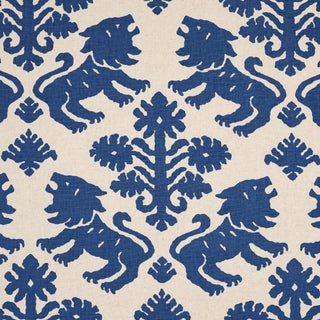 Regalia is an artisanal print featuring mirrored silhouettes of rampant lions and stylized flowers on a textural union cloth ground. Sold as a 2-yard minimum.