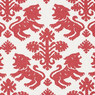Regalia is an artisanal print featuring mirrored silhouettes of rampant lions and stylized flowers on a textural union cloth ground. …