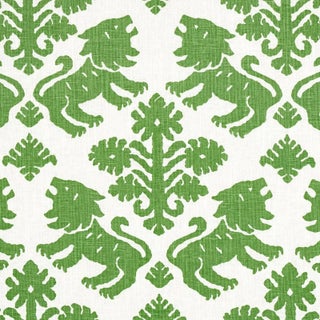 Regalia is an artisanal print featuring mirrored silhouettes of rampant lions and stylized flowers on a textural union cloth ground. Sold as a 2-yard minimum.