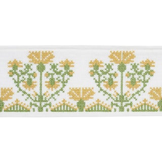 Inspired by an 18th-century trim, Custis Embroidered Tape features wonderful, stylized carnations stitched on a linen ground. The delicate pattern on this 3.5-inch-wide tape captures the artistry and charm of the original cross-stitched design. This trim adds polish and a lovely finishing touch to window treatments, upholstery, and pillows. © 2022 The Colonial Williamsburg Foundation. WILLIAMSBURG is a trademark of The Colonial Williamsburg Foundation.