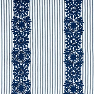 An inventive, fashion-inspired large-scale pattern, this design features gorgeous floral bands stitched on our crisp Wellfleet Ticking Stripe. Made of 100% cotton, Joelle Stripe in blue combines feminine floral motifs and tailored menswear elements in a fabric that makes a stylish statement on windows, upholstery or pillows.