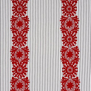 An inventive, fashion-inspired large-scale pattern, this design features gorgeous floral bands stitched on our crisp Wellfleet Ticking Stripe. Made of 100% cotton, Joelle Stripe in red-on-black combines feminine floral motifs and tailored menswear elements in a fabric that makes a stylish statement on windows, upholstery or pillows.
