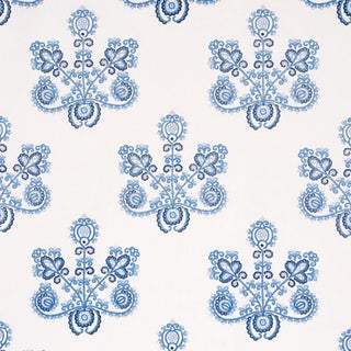Estrella's stylized floral motifs are delicately embroidered on a cotton-linen ground. Its open, porcelain-colored design layers beautifully with other patterns.