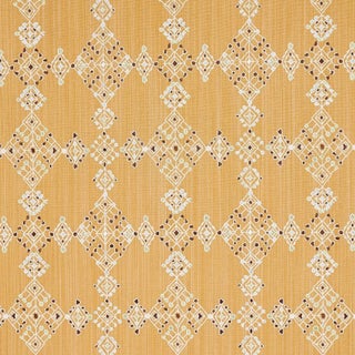 Inspired by Moroccan needlework, Kalindi Embroidery in saffron features mid-scale abstracted florals and geometric motifs embroidered on hand-dyed cotton. Stitched in shiny threads, these delicate patterns have a subtle shimmer against a lovely strié ground, making this a wonderful fabric for upholstery, pillows and window treatments.